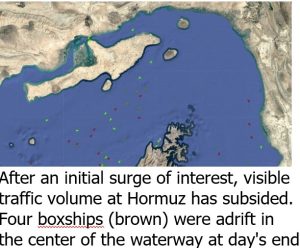 Based on AIS data, it appears that there was a small increase in movements early afternoon, but by midnight traffic had eased off. Most traffic was sticking to Iranian waters on the eastern side of the approaches to the Strait. No traffic was seen using the internationally-recognized Traffic Separation Scheme (TSS), but some ships were transiting the Strait on a direct east-west route through Omani waters close in to the Musandam peninsula, and through what Iran has designated a danger area. Amongst these ships was the Maltese-registered cruise liner Celestyal Discovery (IMO 9221566). The multiplicity of routes being followed by different vessels in restricted waters, some moving in opposite directions, inevitably raises the danger of collision when compared to a TSS.