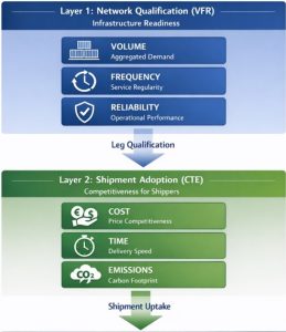 In simple terms, there is a difference between what can scale and what will scale. The first depends on infrastructure performance and transport service design, while the second depends on whether transport services meet shippers’ expectations and constraints. Bridging this gap is essential for achieving system-wide transformation, as illustrated in Figure 1 through the alignment of infrastructure readiness and shipment adoption.