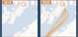 One example is Canada’s Mary River Mine, which began production in 2015 at one of the world’s richest iron ore deposits. Since then, bulk carrier traffic into Baffin Bay has surged manyfold, with ships logging over 130,000 nautical miles in 2025 alone hauling ore and supplies .